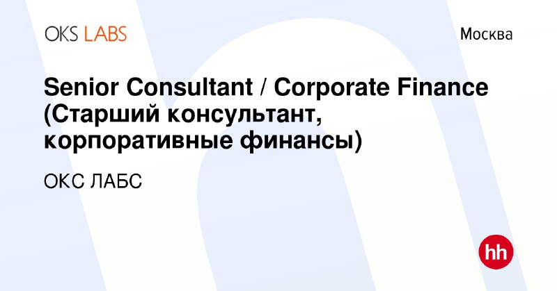 hh.ruВакансия Senior Consultant / Corporate Finance (Старший консультант, корпоративные финансы) в Москве, работа в компании ОКС ЛАБСЗарплата: не указана. Москва. Требуемый опыт: 1–3 года. Полная занятость. Дата публикации: 25.01.2024.